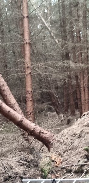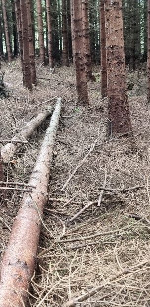 Leaning trees have been felled to remove pressure on their neighbours and then cut the lengths and left to help weigh down remaining root plates and then decompose.